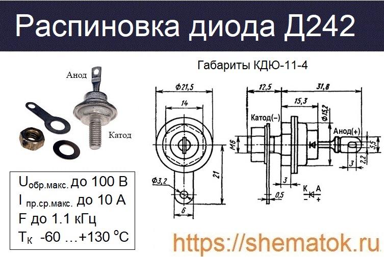 Д242 изготавливают в металлостеклянном корпусе КДЮ-11-4. Буквенно-цифровое обозначение и схема подключения выводов указана на внешней стороне упаковки. Вес изделия со всеми комплектующими не превышает 18 г. Внешний вид и габариты приведены на рисунке.