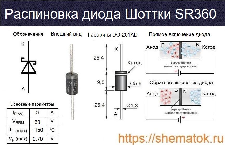 SR360 оснащён современным пластиковым корпусом DO-201AD. Более старые версии диода имеют пластмассовую упаковку DO-27. Внешний вид устройства, его габариты и распиновка приведены на рисунке ниже.