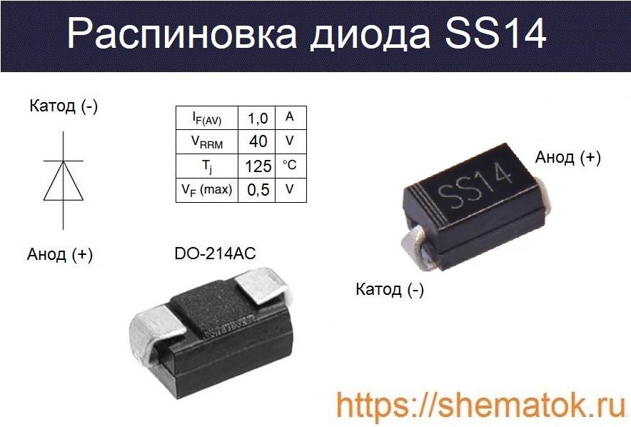 Диод SS14 производится в небольшой пластиковой SMD-упаковке SMA/DO-214AC. Имеет два луженных вывода анод (А) и катод (К), который отмечен на корпусе четырьмя полосками. Масса изделия не превышает 0,064 г.