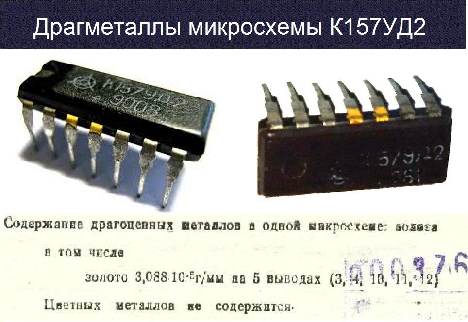 К157УД2 до 1996 года выпускалась на очень известном в Советском союзе украинском предприятии радиоэлектронной промышленности «Полярон» г.Львов. В настоящее время завод прекратил производство своей продукции и к сожалению не работает. Но информацию о содержании драгметаллов есть в этикетке на микросхему: золото 0,003088 гр. Цветные металлы в устройстве отсутствуют.