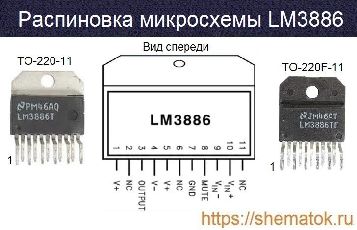 Если по простому, то распиновка lM3886 следующая, смотрим по номерам контактов: 4 – минус питания,  1 и 5 – плюс; 7 – земля (GND) или общий ноль; 9 и 10 инвертирующий и неинвиртирующий входы, соответственно; 3 – выход для усиленного сигнала; 8 – функция «mute»; 2 и 11 – не используются