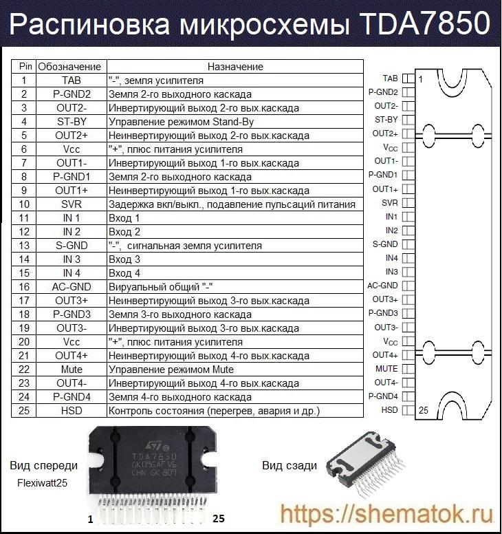 TDA7850 выпускается в фирменном пластиковом корпусе от STM — Flexiwatt25. Существует две версии упаковки: для горизонтального и вертикального монтажа на плату. Внешний вид данных микросхемы и распиновка представлены на изображении ниже.