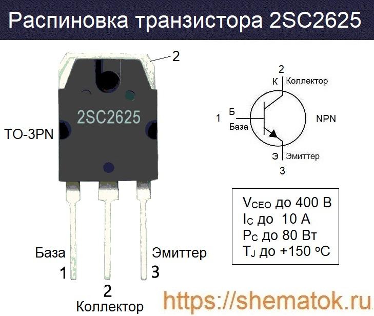 2SC2625 в соответствии с техническим описанием считается силовым, высокочастотным биполярным транзистором. Производители отмечают его очень высокую надежность, при минимальном отклонении параметров во всех партиях. Несмотря на небольшие габариты, устройство выделяется способностью выдерживать довольно большие напряжения на эмиттерном переходе (до 400 В). Постоянный коллекторный ток на пике может достигать 10 А.