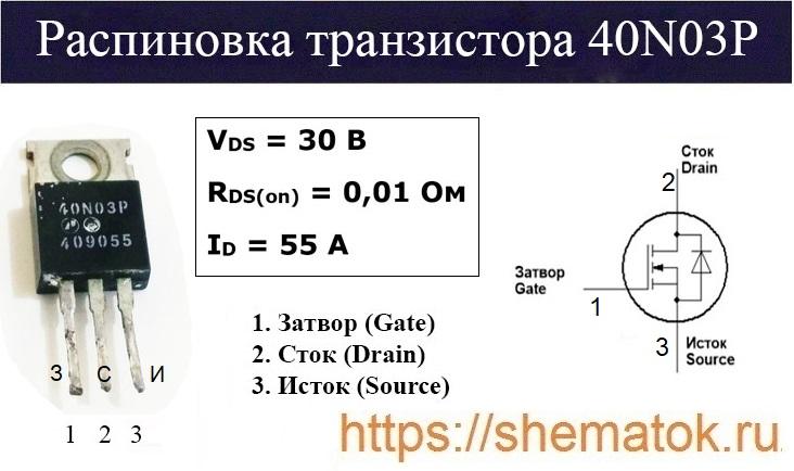 Мощный полевой, n-канальный транзистор 40N03P, по своим техническим характеристикам обеспечивает высокую скорость переключений, хорошую надёжность и низкое сопротивление на переходе (до 10 мОм) при включении в прямом направлении. Он широко используются в схемах с низким напряжением питания (до 30 В), преимущественно в преобразователях электрической энергии. Довольно часто встречается в импульсных блоках питания для компьютеров и другой бытовой техники.