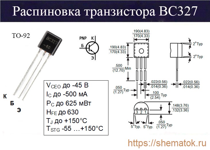 BC327 собран в стандартной зарубежной пластмассовой упаковке ТО-92. Вес последнего не превышает 0.9 г. Для определения назначения контактов, необходимо взять в руки транзистор и посмотреть на его маркировку. Три расположенные вниз металлических вывода транзистора (слева на право) являются коллектором (К), базой (Б) и эмиттером (Э). Фотография устройства, цоколевка и габариты показаны на рисунке.