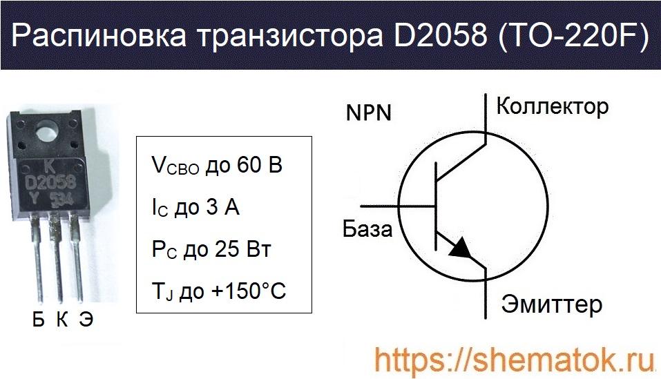 Полное обозначение транзистора — «2SD2058». Первые два символа «2S» в маркировке корпуса не используются. Он встречается только в пластиковой упаковке TO-220F. Имеет следующую цоколевку (слева на право): левая ножка – вывод базы (Б), средняя – коллектор (К), а правая является эмиттером (Э). Корпус оснащен отверстием для крепления к радиатору.