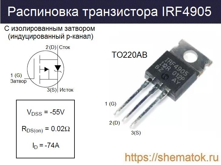 В соответствии с техническими характеристиками, irf4905 представляет из себя MOSFET-транзистор компании International Rectifier (IRF). Применённая в нём технология пятого поколения HEXFET позволила значительно уменьшить площадь кремниевой площадки (в сравнении с предыдущими версиями) и добиться очень низкого сопротивления во включённом состоянии. Указанные улучшения создали условия для достижения более высокой скорости переключений и прочности в конструктивном исполнении.