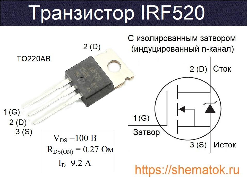 irf520 имеет следующую распиновку. Большинство производителей выпускают его в корпусе ТО-220АВ. Если смотреть на транзистор со стороны маркировки, то назначение контактов такое: самая левая ножка — это затвор (G), посередине находится сток (D), а справа исток (S).