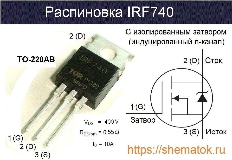IRF740 встречается в стандартном корпусе ТО-220AB, выдерживающем достаточно высокие температуры и мощность рассеивания до 50 Вт. Распиновка (цоколевка) характерна для большинства полевиков  компании IR — левая ножка — затвор, средняя — сток и крайняя правая -исток. Для определении распиновки всегда смотрите на лицевую сторону устройства, на которую нанесена маркировка. При непосредственном монтаже на плату надо учитывать физическое соединение корпуса с выводом стока. На рисунке распиновка irf740 представлена более наглядно.