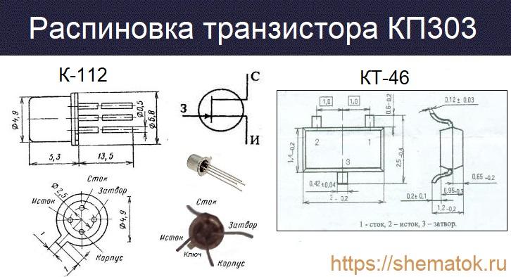 У КП303 классическая цоколевка, характерная для транзисторов в метеллостеклянной упаковке КТ-112 (по часовой стрелке от ключа): исток (И), сток (С), затвор (З), корпус. Своеобразной особенностью этой серии является то, что в отличии от других транзисторов она имеет не три, а четыре гибких вывода. Вместе с тем, в настоящее время встречаются SMD-устройства в более современном КТ-46 (SOT-26) c 3-мя контактами. Более подробно габариты, внешний вид таких изделий и распиновка приведены на картинке ниже.