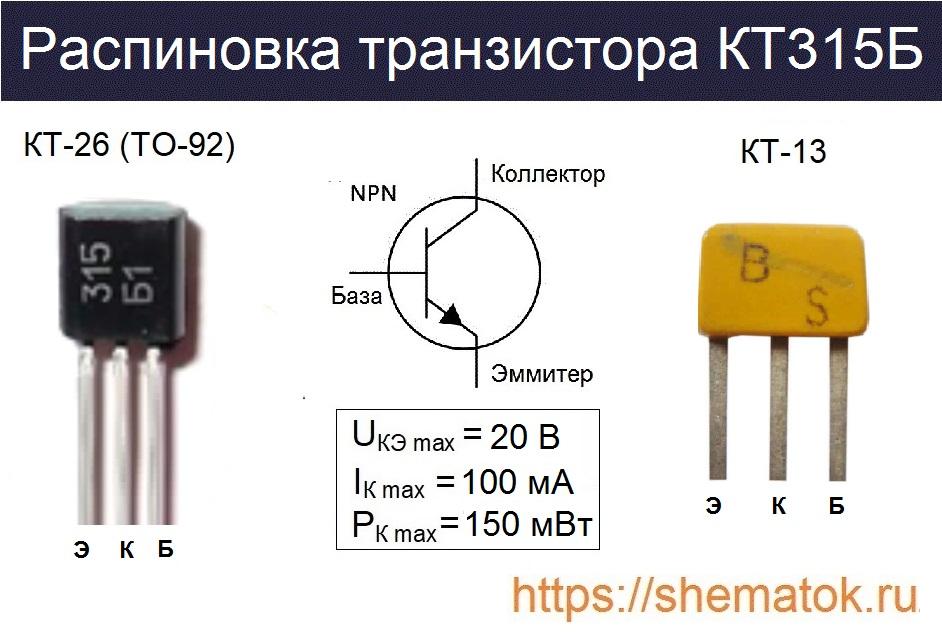 Цоколевка современного КТ315Б, выпускаемого в наши дни преимущественно выполнена в корпусе ТО-92 (отечественный КТ-26), имеет следующий вид. Эта стандартная пластиковая упаковка для подобных транзисторов имеющая три гибких металлических вывода. Если смотреть на её маркировку, то первая левая ножка — это эмиттер (Э), следующая – коллектор (К) и последняя – база (Б). Такое назначение контактов характерно для всех групп устройств серии КТ315, независимо от их корпусного исполняя – Э.К.Б.кт315б распиновка