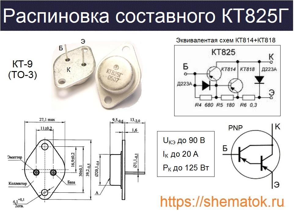 Серию КТ825 относят к полупроводниковым триодам с p-n-p-проводимостью. Но на самом деле они представляют собой устройства состоящее из двух таких структур, собранных в едином корпусе по схеме Дарлингтона. В СССР их ещё называли — составными.