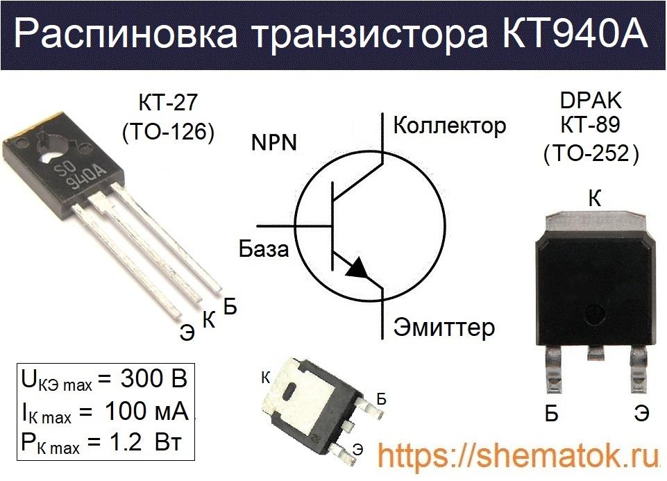 В технических характеристиках транзистора KT940А указано, что он относится к усилительным, кремневым, биполярным, полупроводниковым триодом средней мощности, имеющим NPN-структуру. Применяется в видеоусилителях телевизоров, усилителях постоянного тока и различных бытовых приборах широкого использования. Изготавливается по эпитаксиально-планарной технологии.