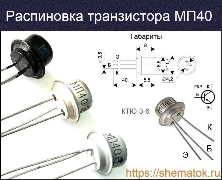 На изображении ниже представлены внешний вид и распиновка МП40. Устройство производилось в метоллостеклянном корпусе (КТЮ-3-6). Назначение трех металлических гибких выводов (слева на право) следующее: коллектор (К), база (Б), эмиттер (Э).